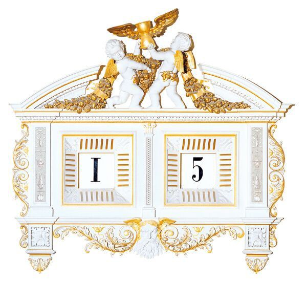 1841年,鐘表師暨宮廷鐘表師約翰克里斯迪昂菲烈特里西古特凱斯(Johann Christian Friedrich Gutkaes)接下了這項艱巨的任務。這任務最大的挑戰是需要設計一個即使在黑暗中,所有觀眾席上的座位仍能清晰讀時的時鐘。由于時鐘需懸掛于臺前圓拱上僅兩米高的空間,因此圓形鐘盤并不可行。為此古特凱斯一施妙計,希望設計一個數字顯示時鐘。時鐘擁有兩個直徑1.6米的反方向逆轉滾筒,于舞臺上方的雙視窗顯示時間。左邊以羅馬數字顯示小時,右邊每隔5分鐘以阿拉伯數字顯示分鐘。